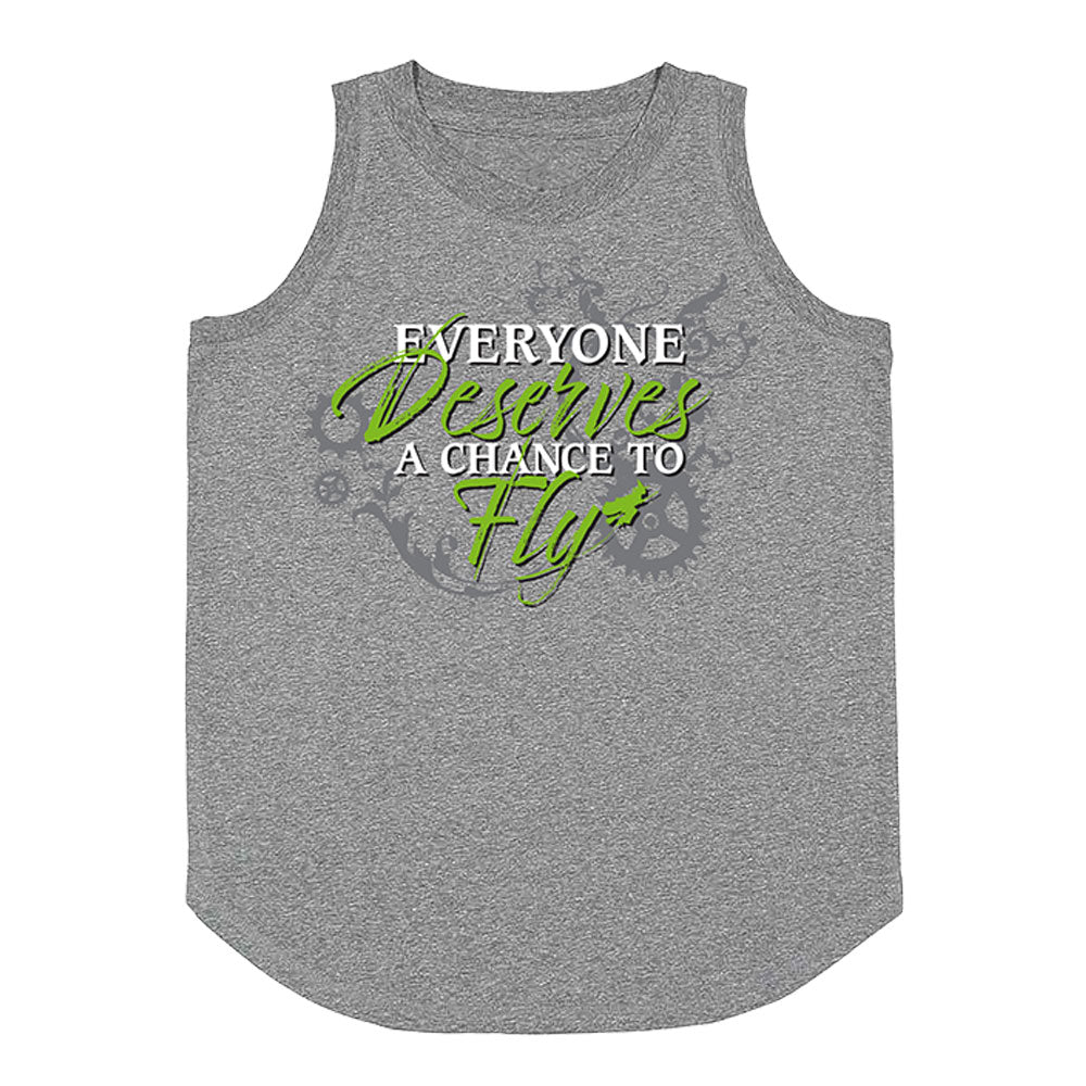 Defy gravity with this grey tank showcasing the words "Everyone Deserves a Chance to Fly" on the front and the Wicked logo on the back.
