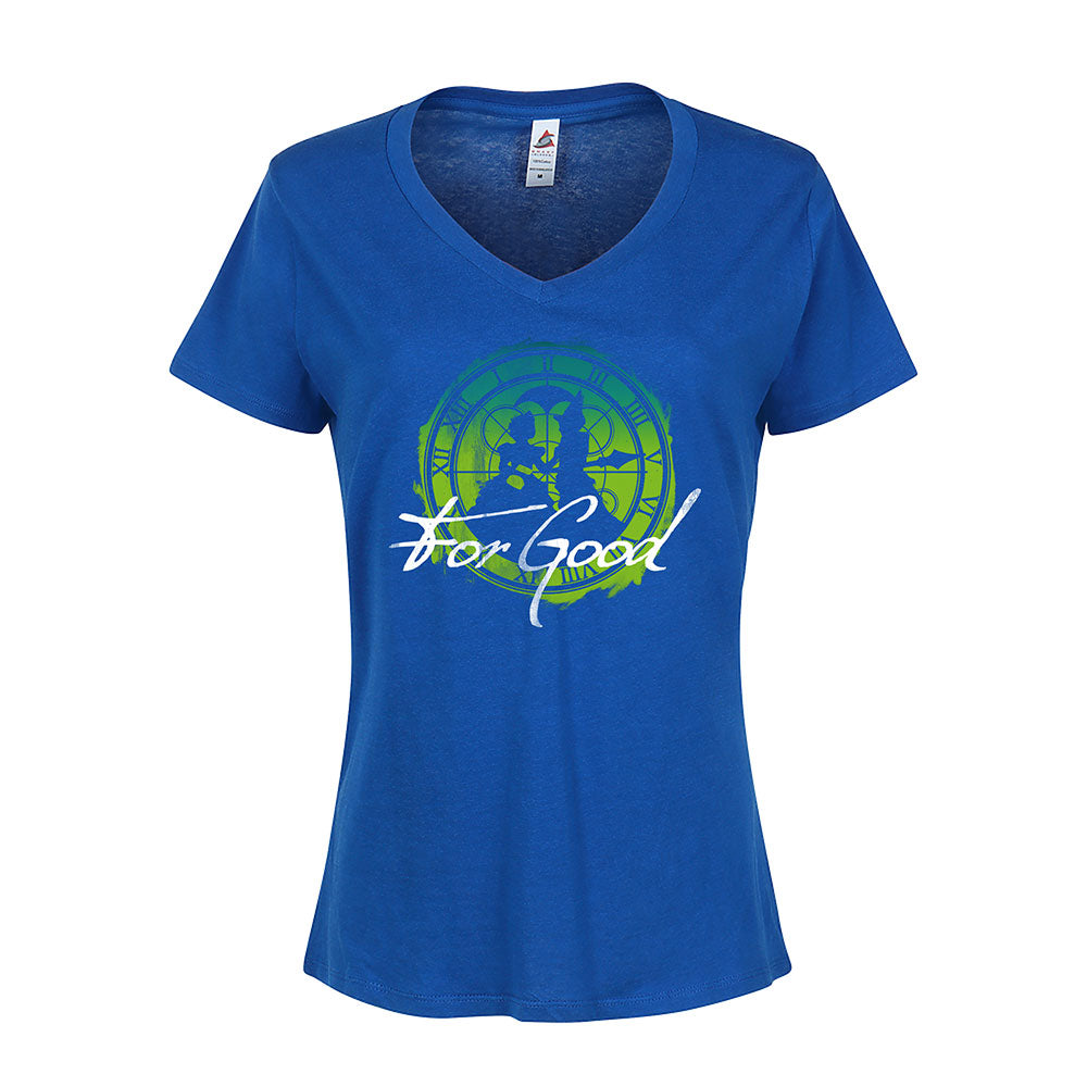 Blue fitted v-neck featuring the Time Dragon Clock, silhouettes of Glinda and Elphaba, and the song title For Good from Wickedon the front.